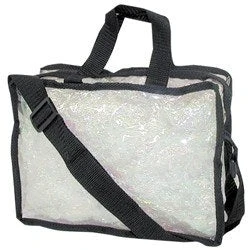 Clear vinyl zippered tote with black trim, inside zipper pocket and adjustable shoulder strap. Measures: 8″H x 11″W x 4″D.