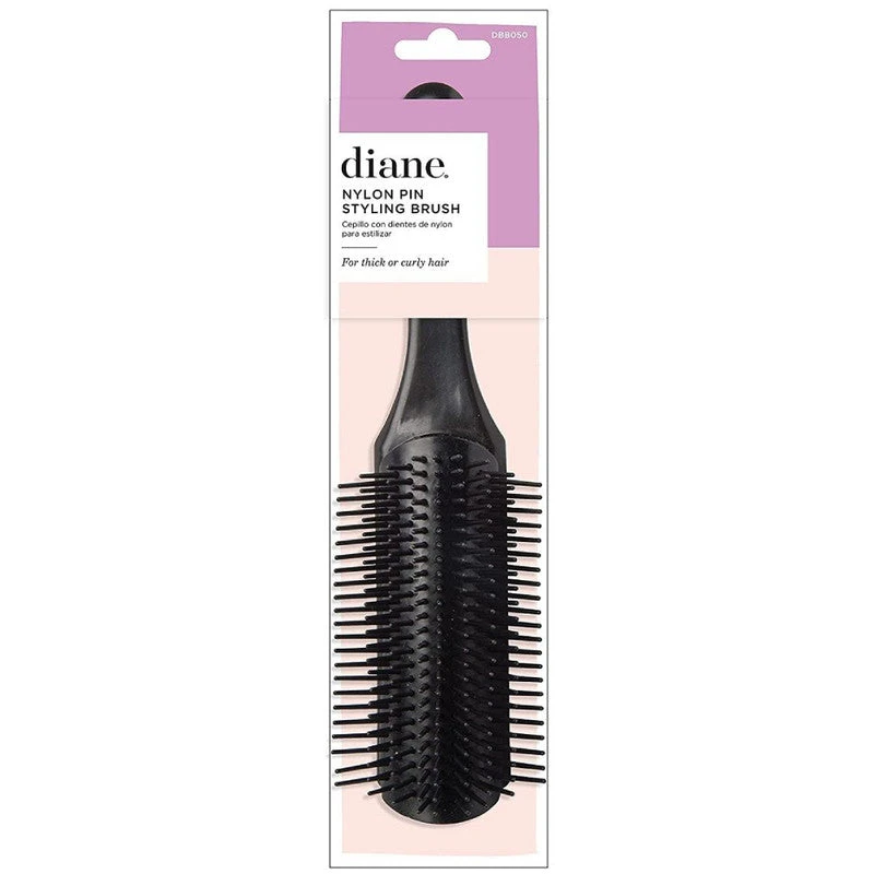 The Diane Nylon Pin Styling Brush features 9 rows of firm nylon pins in a black color. It is ideal for thick and curly hair, allowing you to separate and define wet curls while evenly distributing conditioner or product. With its firm pins, this brush is sure to help you obtain the perfect look.