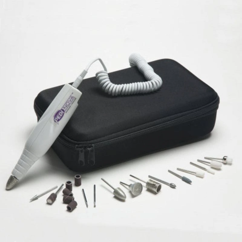The PediNova Pro is a powerful, high performance, combination Pedicure and Manicure machine. This set includes 14 professional tools and a travel case. The PediNova features a powerful variable speed 20,000 rpm motor and is ideal for trimming and shaping both fingernails and toenails, smoothing rough skin and calluses, as well as shaping acrylic and gel nails. The PediNova comes with a Full One-Year Warranty.