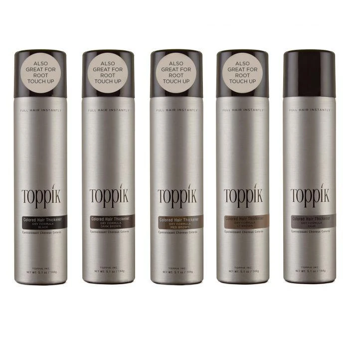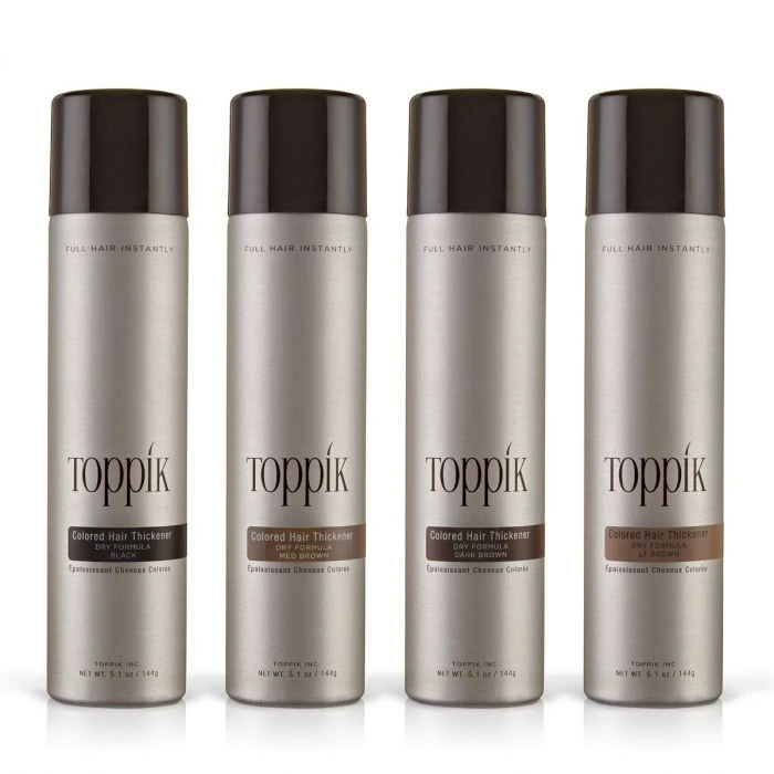 Toppik Colored Hair Thickener is an innovative color spray solution designed to disguise areas of thin or thinning hair, scalp show-through, bald spots and root re-growth between color appointments.